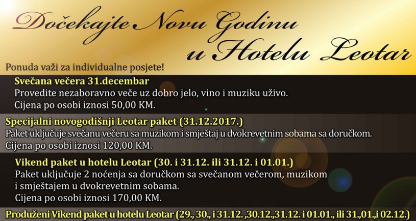 Lider u hotelijerstvu Istočne Hercegovine, hotel sa tradicijom od punih 70 godina, i ove, kao i prethodnih godina organizuje novogodišnji doček, sinonim za novi početak, vedre snove i raznolike želje.