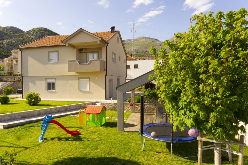 Jednosoban apartman smješten je u prizemlju kuće i raspolaže sa izuzetno prostranim dvorištem, koje je pravi mali raj, kako za mališane, tako i za odrasle. Posjeduje mobilijar za djecu, kao i ljetnikovac sa ugrađenim roštiljem, pa je zabavan odmor zagarantovan. Dvorište krasi pažljivo birano cvijeće i bilje, a voćke, poput čuvene trebinjske trešnje, upotpunjuju sliku. Gosti se u sezoni mogu sami poslužiti zrelim, slatkim plodovima.