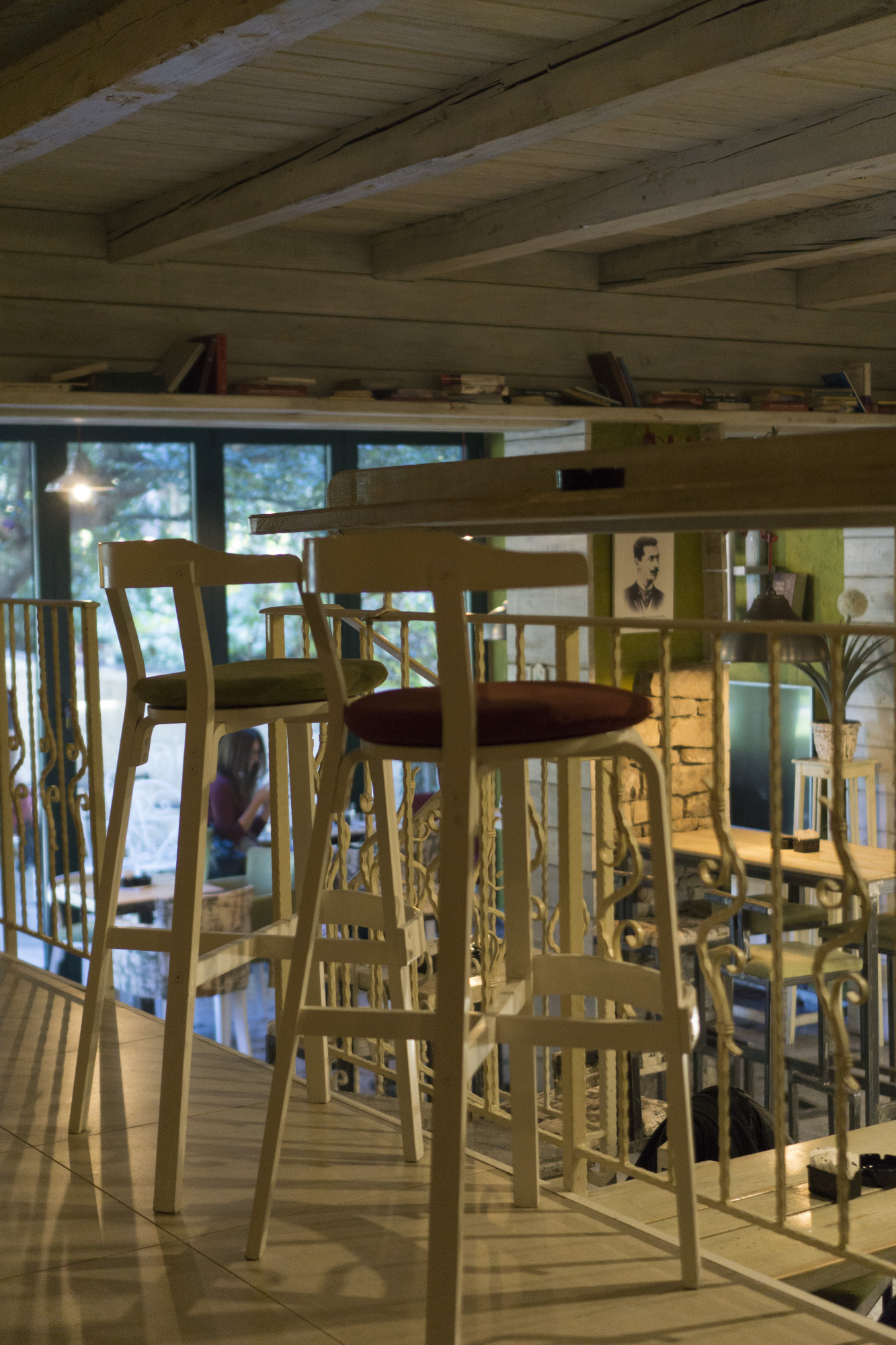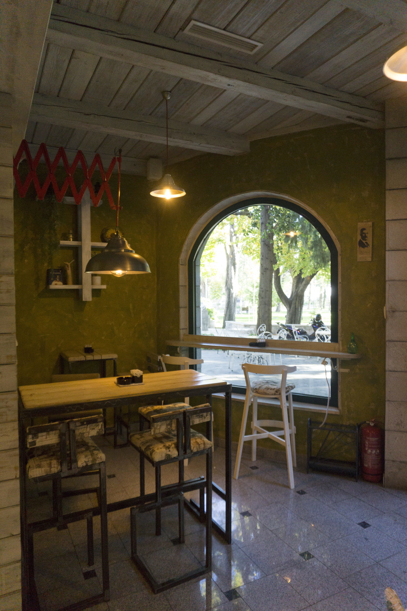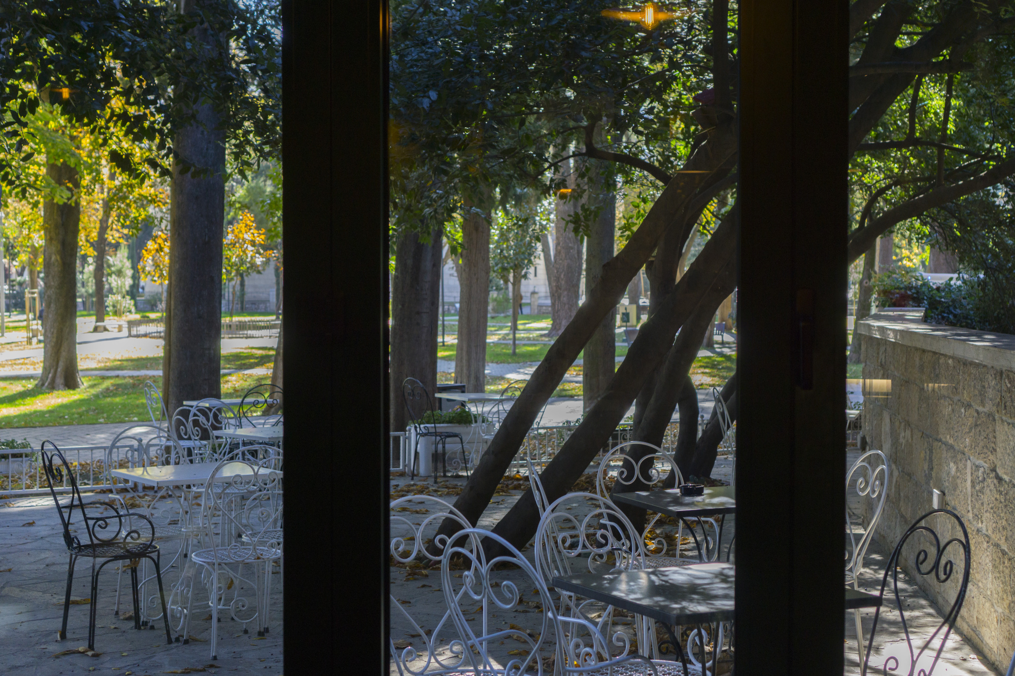 Velika prozorska okna, koja preko dana lokal obogaćuju kako prirodnom svjetlošću tako i izuzetnim pogledom na zelenilo gradskog parka. Ona prave poseban ugođaj u kišnim jesenjim ili snježnim zimskim danima.